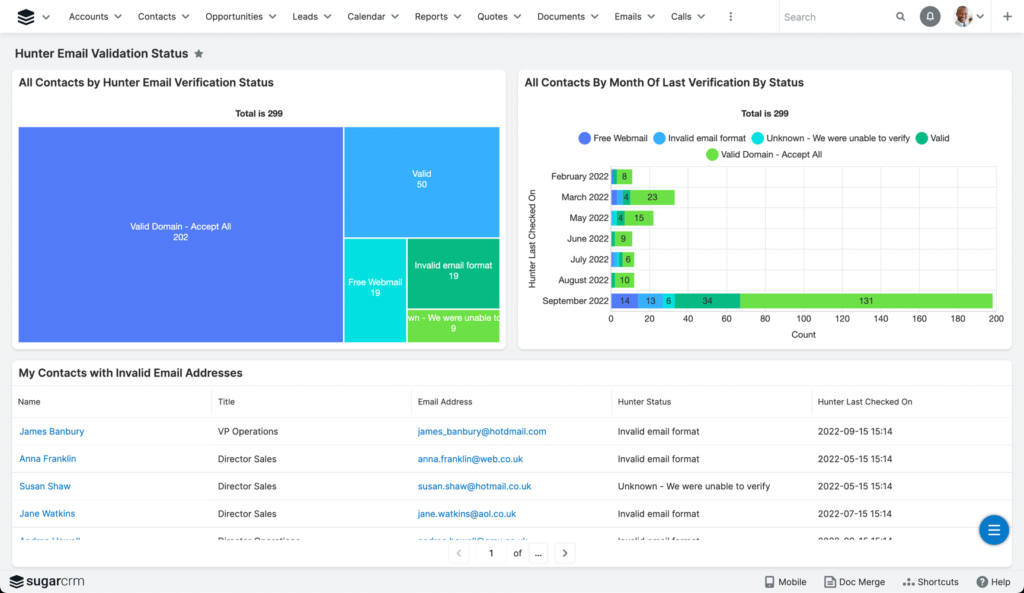 This product will enable a tool in Sugar that will help users verify email addresses by leveraging the powerful Hunter.io verification system. This will prevent developing a bad IP reputation over time, ensuring you are only targeting verified email addresses.