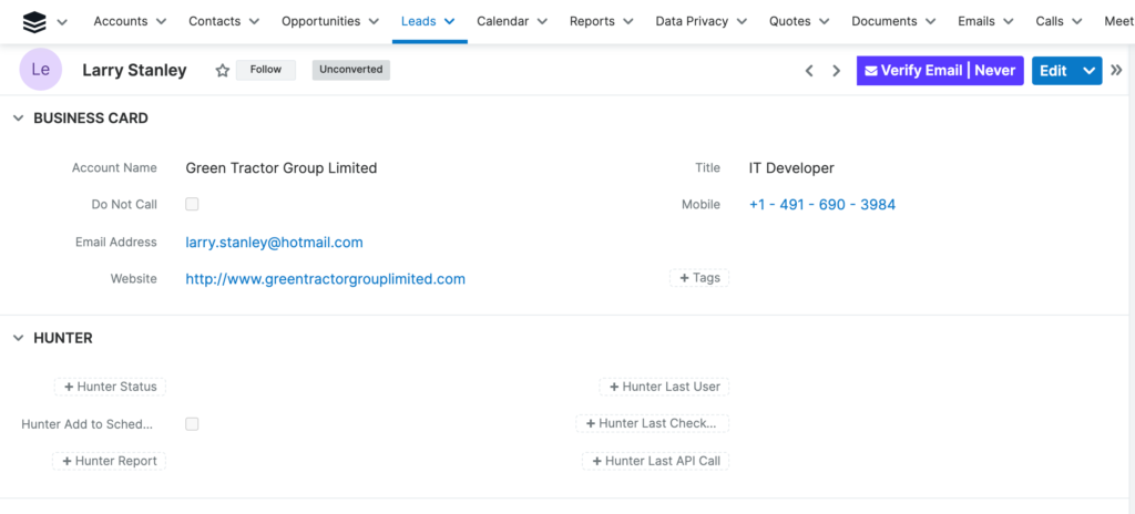 Clicking on this button will initiate the verification of the records’ primary email address and return the results into the Hunter-related fields as well as the button.